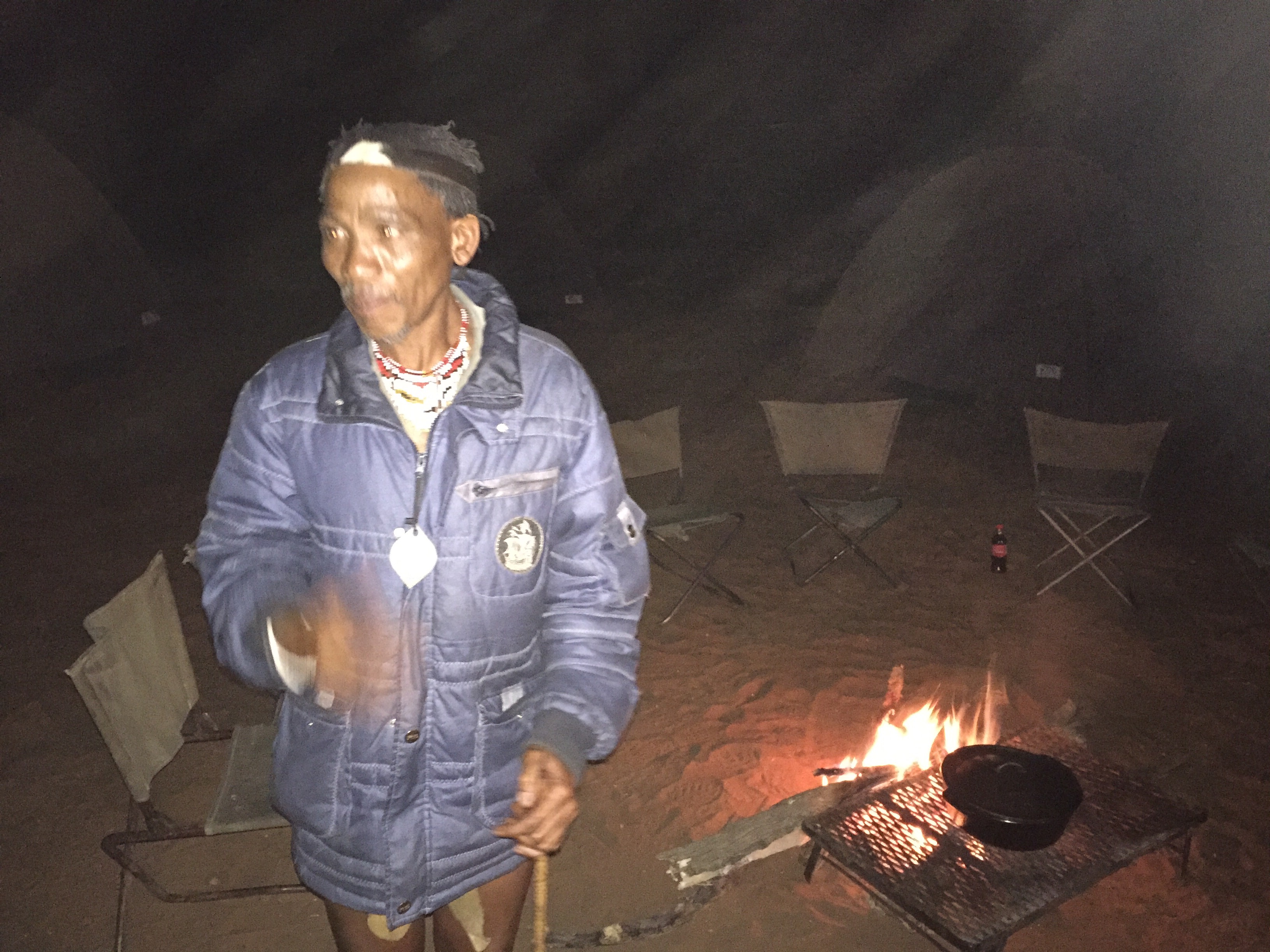 We arrived as the light was failing and a crepuscular gloom was enveloping the dusty earth and obdurate bushes surrounding the campsite. As we erected our tents, I couldn’t help but notice an addition to our group. A very thin manx incongruously dressed in a thick jacket and a loincloth, was quietly observing us with a benign smile. Tent set up, I went over to shake his hand and learned he was called Gowha and was one of the elders of the Naro tribe of the San people.