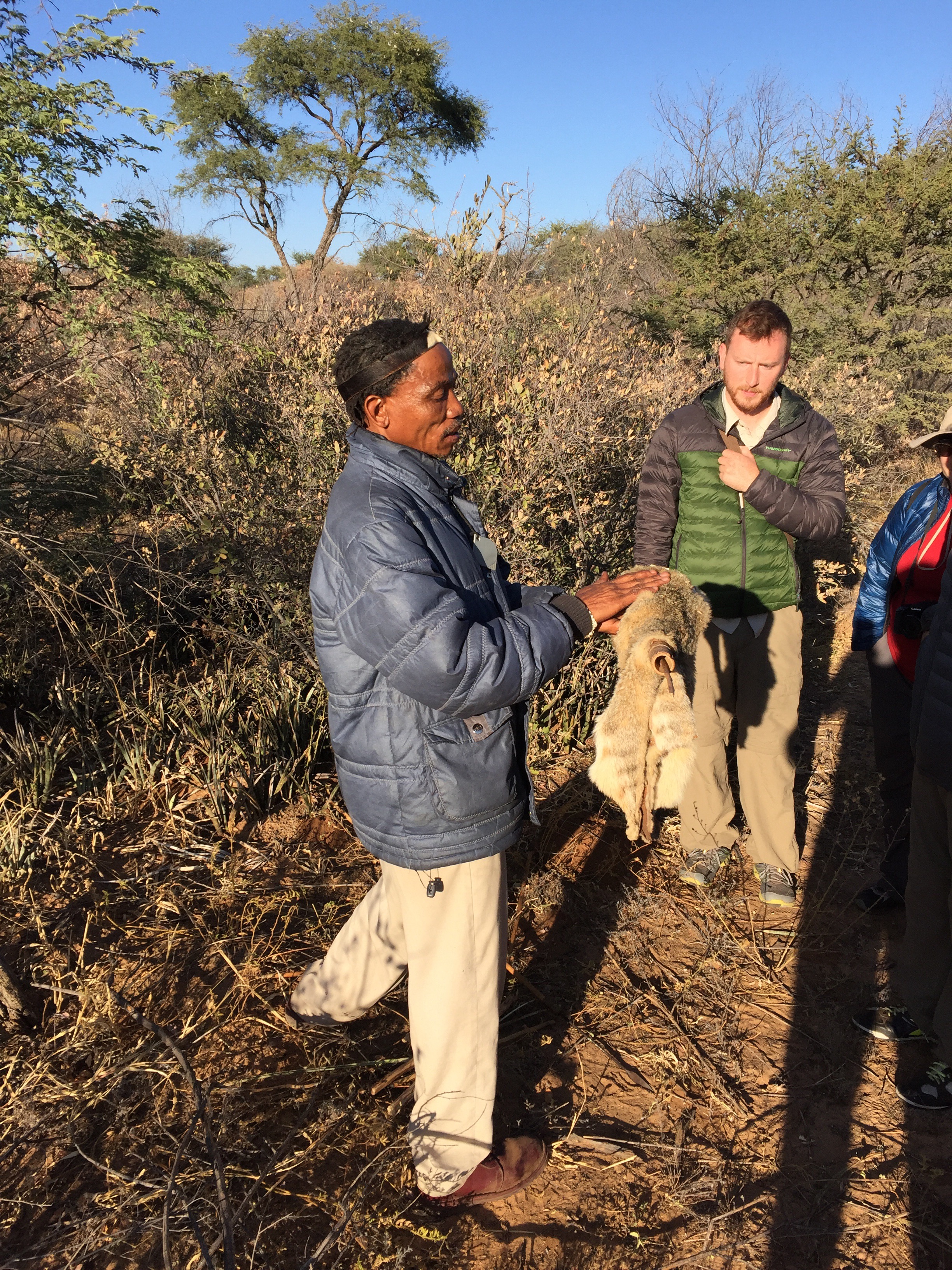 True to his word, as we emerged from our tents, blinking in the crisp, early morning sunlight, there was Gowha, carrying a thin walking stick, a spear, a bow and arrow and several other implements in a bag made from the skin of a wildcat. He preceded to lead us through the bush, explaining which roots were edible, which were used for medicine, what a scorpion hole looked like, how to make fire from what nature provides. He read the natural world around him with the ease that a programmer reads code. It was truly fascinating.
