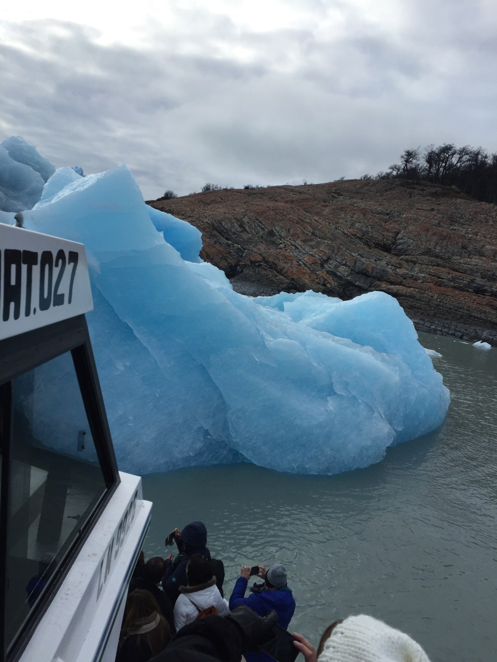 After a walk along various viewpoints on the bluff opposite the glacier, we boarded a boat to take a closer look and examine some of the icebergs that had splintered off. Spotting that I was travelling alone I was adopted by three middle-aged, Brazilian ladies from Rio who were on holiday. They chatted to me animatedly in friendly Portuguese, my inability to understand seemingly mitigated by my amused smile and occasional shrug.