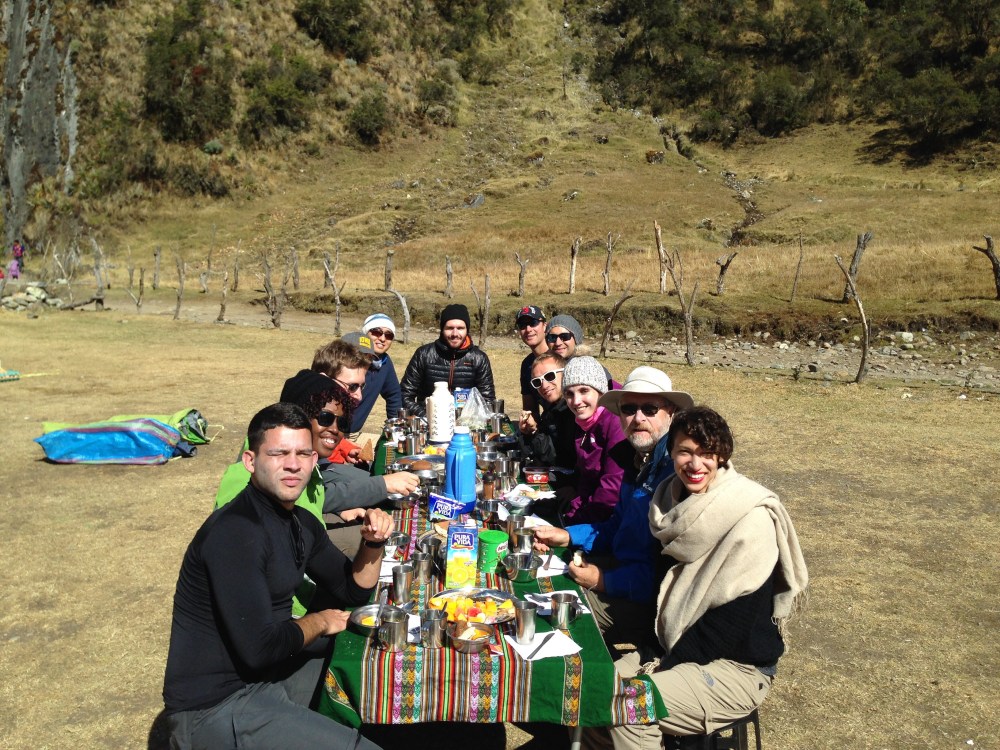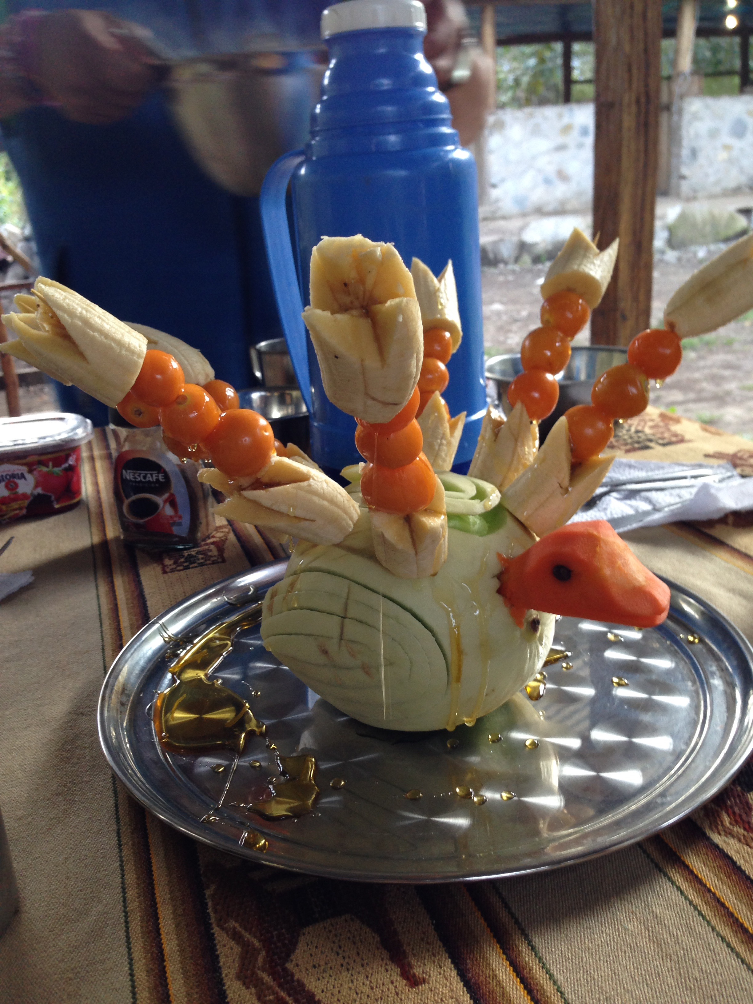This was our first experience of our chef, Alberto’s, cooking. During the course of the trek we ran out of superlatives for the food that this man produced with nothing but a gas stove and oodles of talent. Highlights included a pear flambée, stuffed, deep-fried peppers, chicken ceviche and yuca chips. On one occasion the presentation even reached levels of post-modernist genius…….