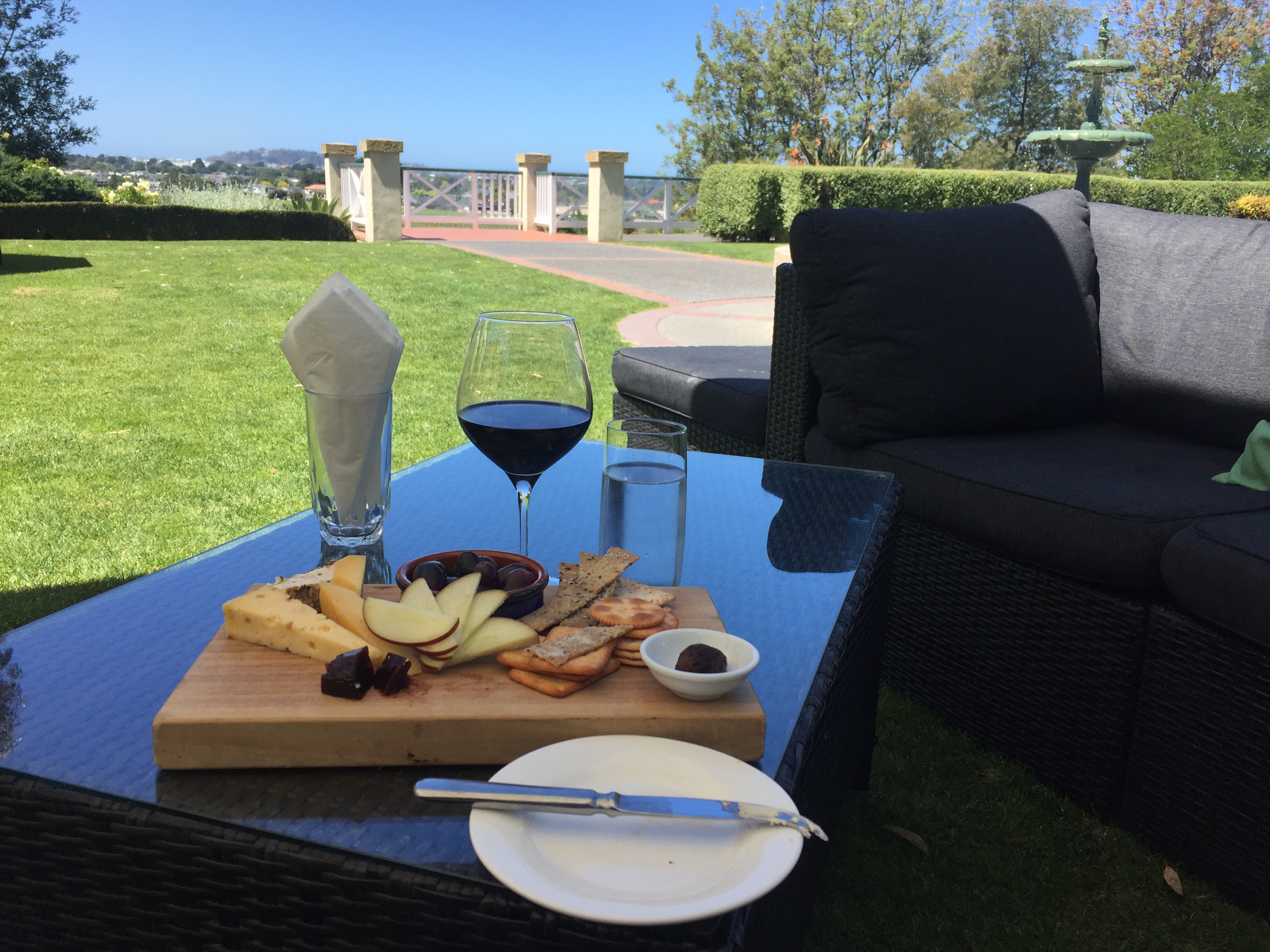 As arguably the oldest winery in NZ, Mission Estate Winery seemed as good a place as any to cease pedalling and, because my life is so stressful, (ducks as friends throw things at him) I treated myself to a glass of Shiraz and a cheese platter. Ahhhhhh, bliss!