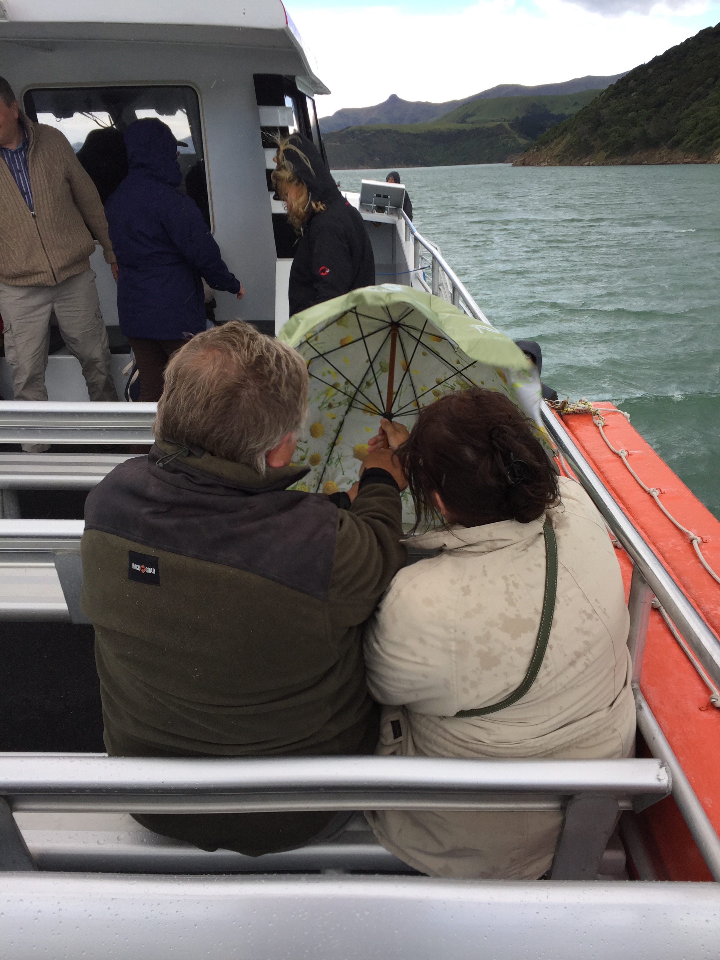 Having driven with alacrity (euphemism alert) I arrived in time for a cruise on the inlet and out to sea to check out the local wildlife and sealife. We boarded amid strong winds and rainfall which, once we were motoring, drove in at us on the top deck almost horizontally. The weather god seemed in merciful mood, however, because after 20 mins the rain relented and the sun smiled shyly through the increasingly thin cloud curtains.