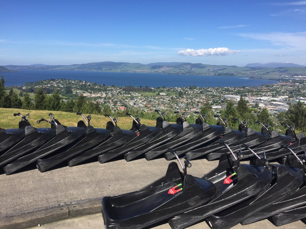Onwards thence to the Skyline – a gondola lift to the top of a steep hill with a view over Lake Rotorua. Into the hillside had been cut a luge track and mountain bike trails. Being the big kid that I am I did the luge. Five times.