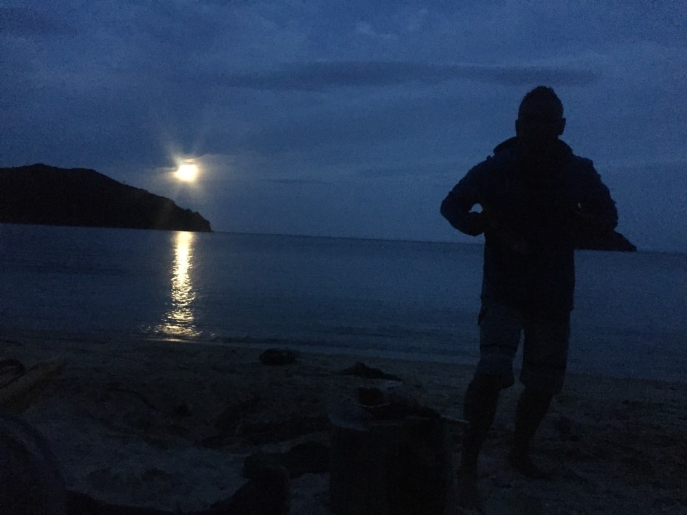 One of the group was the kayak guide, and was of Maori ancestry. The sun set and a large, orange, full moon hung low over the water to the east. The guide called over every last person in the campsite and, with the aid of a conch horn, spellbinding narrative and great theatricality, told an old Maori tale about the first clash of the Maori and European cultures when Abel Tasman came to their waters. It was a highlight for me. I was entranced. It was beautiful.