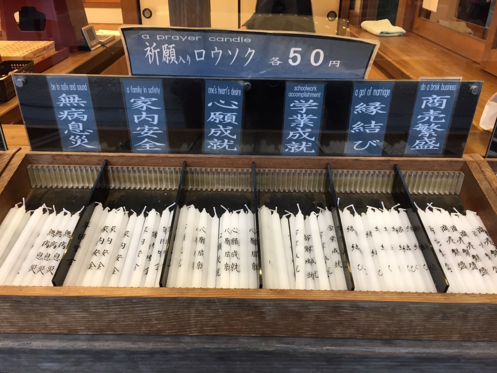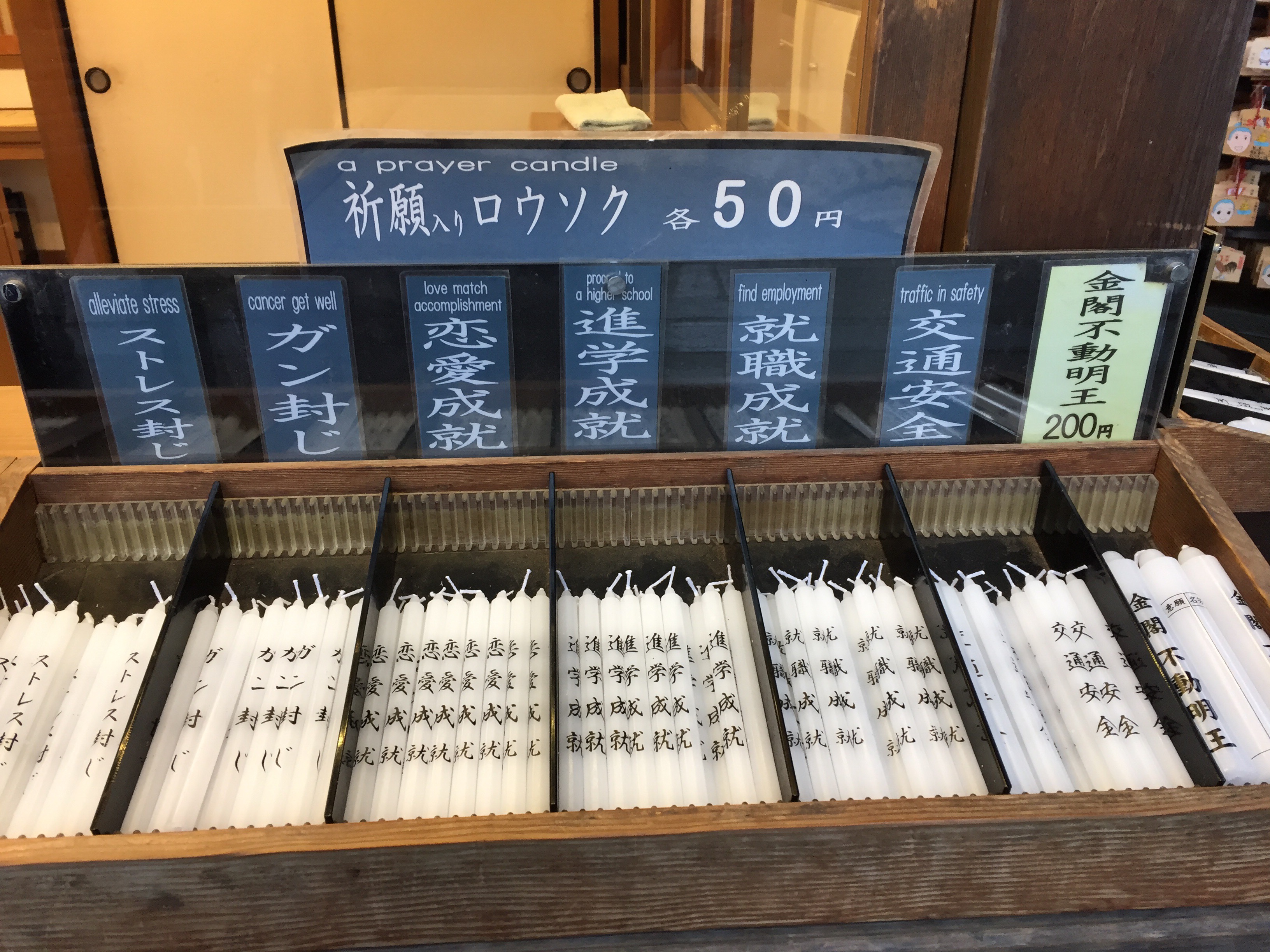 Near the exit lay a small temple where people were buying candles and lighting them in prayer. Closer inspection showed the candles to have very specific purposes. Zoom in if necessary: