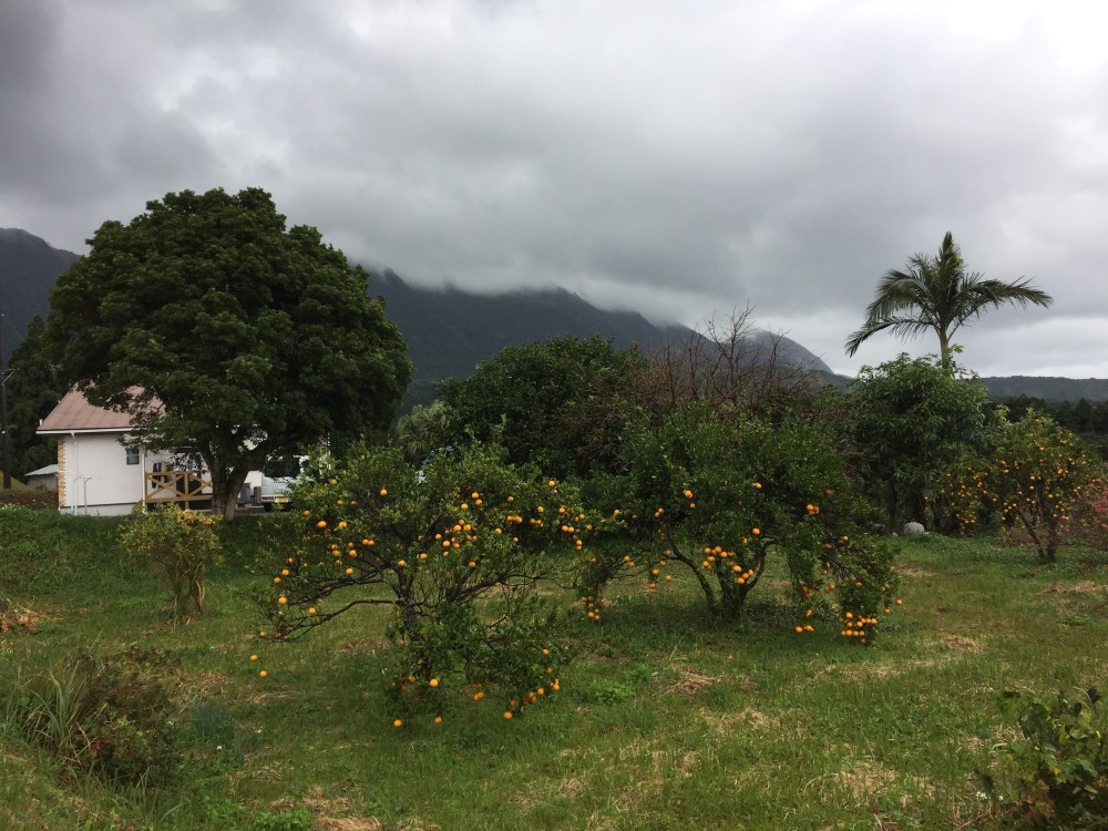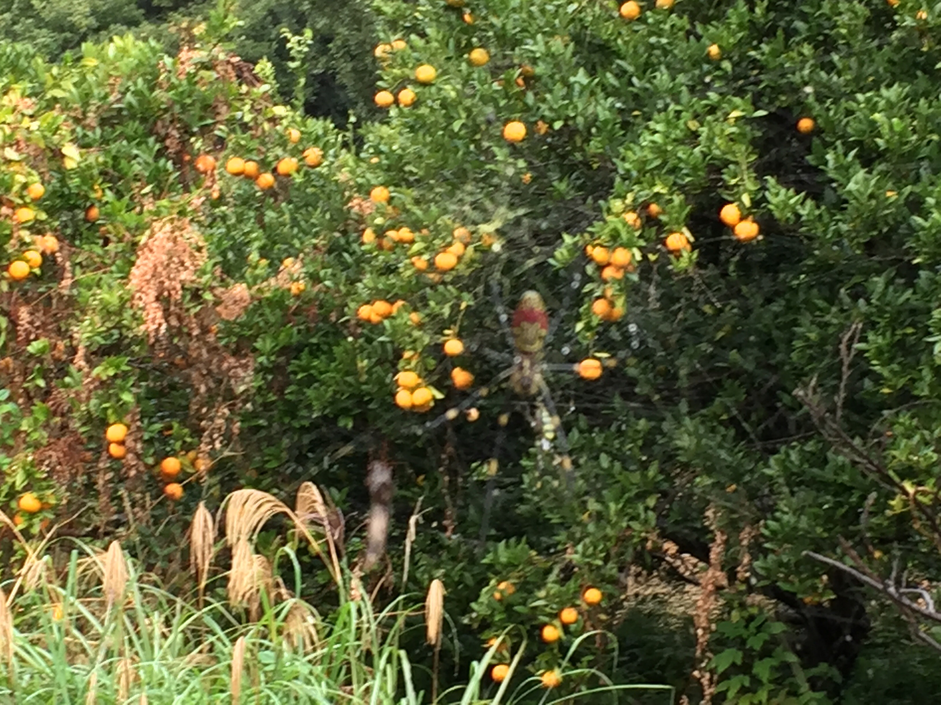 A short walk from Suginoko lay a bridge which afforded great views down to the shoreline, I was informed, so I waited for the rain to stop then meandered in the direction indicated. On my way I passed orchards of Yakushima oranges, plump and ready to fall from the tree. I was not the only observer….