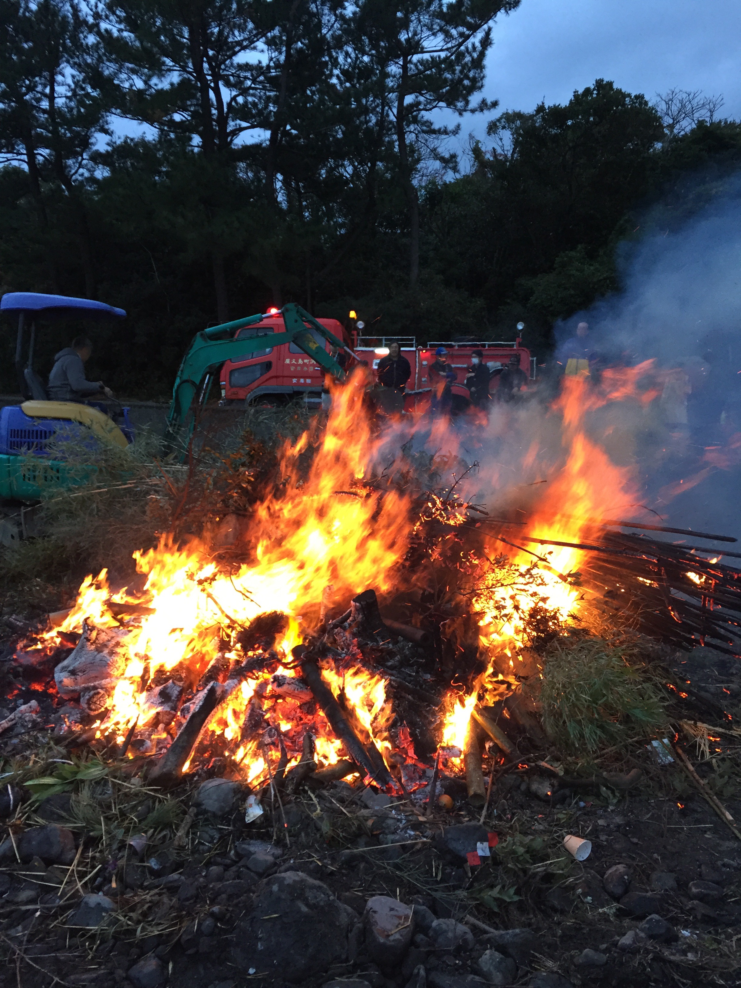 The tradition held that the burning of bamboo would bring luck to the town, however, it nearly did the reverse when the burning column toppled sideways, narrowly missing the waiting fire engine.