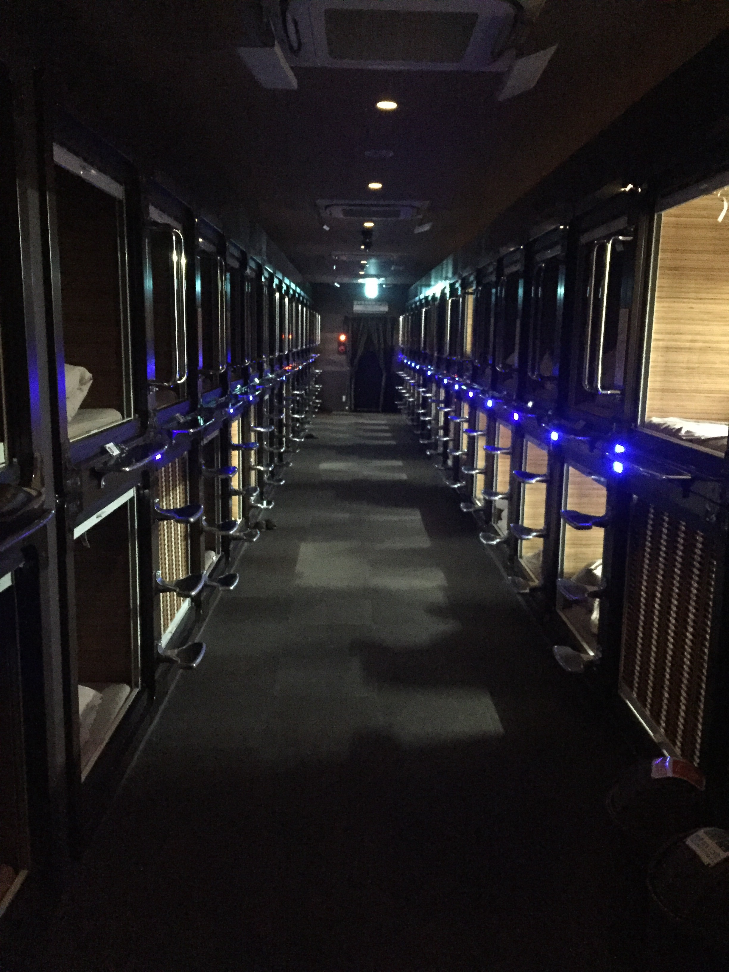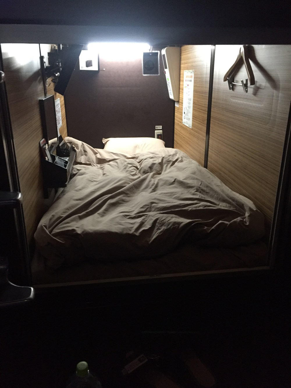 The quality of the facilities was inversely proportionate to the size of the sleeping pods. There was an onsen, clothes washing facilities, a library, TVs, computers, free soft drinks, food vending machines, all sorts of free lotions and potions and grooming tools. My favourite extra? They gave out free nostril-widening plasters to prevent snoring. They must have worked – I slept like a log.