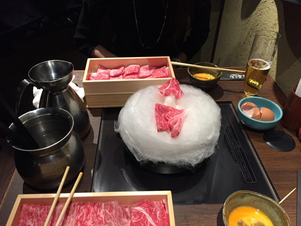 My final evening in Tokyo was dedicated to trying Sukiyaki with Ayako. This had been recommended to me several times but I had never managed to find a restaurant that specialised in the dish. Sukiyaki is a kind of stock-based hotpot I which one cooks one’s own veg, noodles and meat and then dips them in raw egg. It has the distinction of being sweetened somewhat with sugar. If, of course, you want to add a flourish with your sugar, you could melt candy floss in front of your diners instead…..