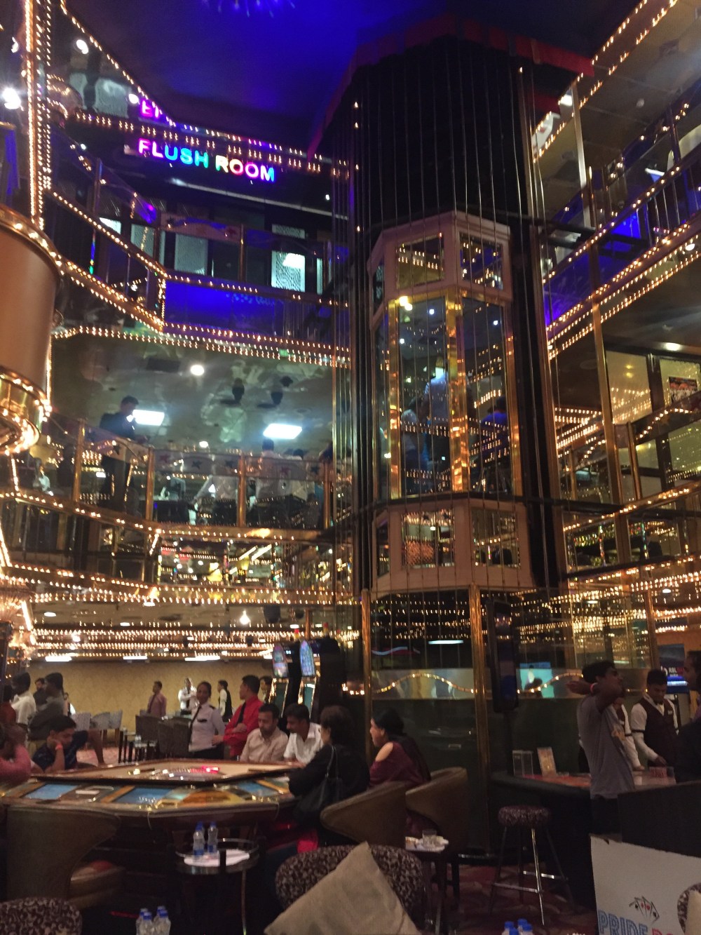 In the boat-sino everything was glitzy yet nothing was glamorous. I sat down to play blackjack next to some young Indians whom, it became abundantly clear, had no idea about game strategy. After watching half of their chip stacks disappear in a heartbeat, I asked whether they’d be interested in learning “best practice”. They declared they would be. Half an hour later we had all doubled our money and the lesson had been a success. Even the croupier seemed to be having fun!