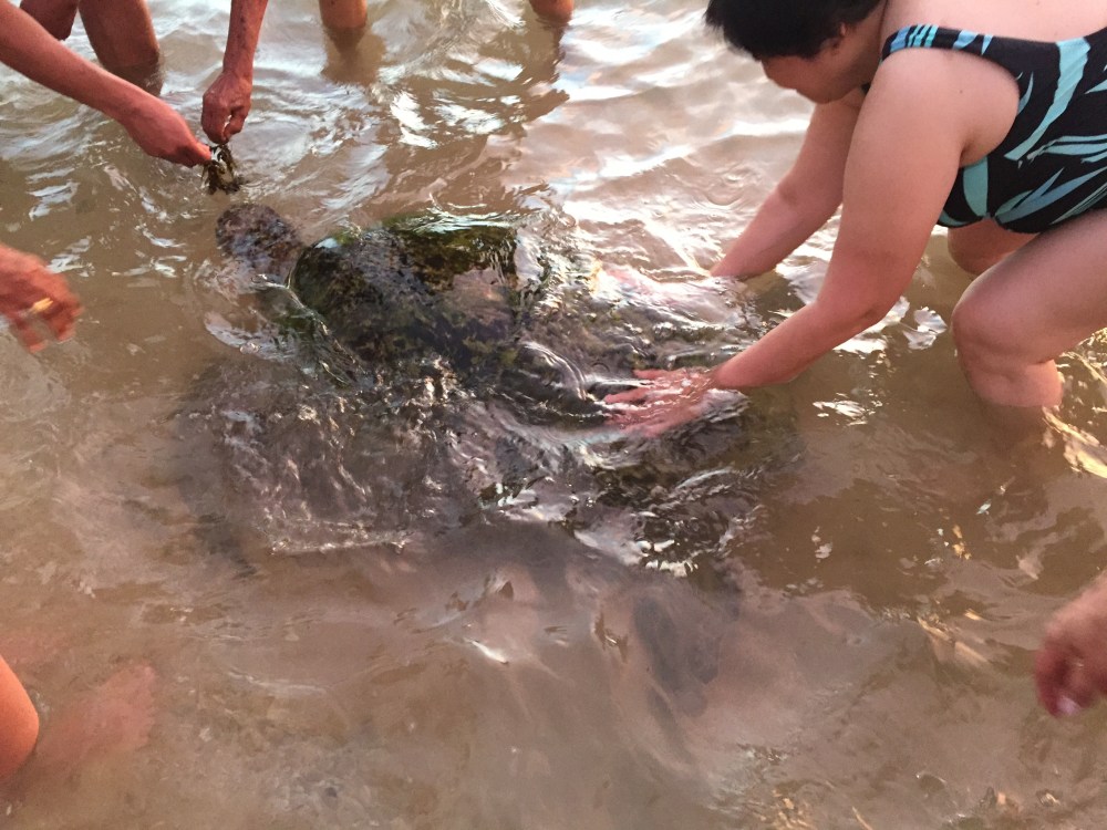 Still mesmerized by the setting sun, I wandered around a rocky outcrop and was immediately shaken from my reverie. There, in the shallow waters, was a gargantuan sea-turtle being petted by some equally large Chinese tourists.